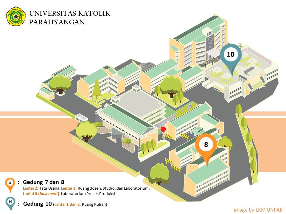 Gedung 7 dan 8 digunakan sebagai ruang dosen, tata usaha, dan laboratorium, sedangkan gedung 10 digunakan untuk melaksanakan perkuliahan. Berikut denah ruangan yang perlu diketahui oleh mahasiswa Teknik Industri UNPAR: