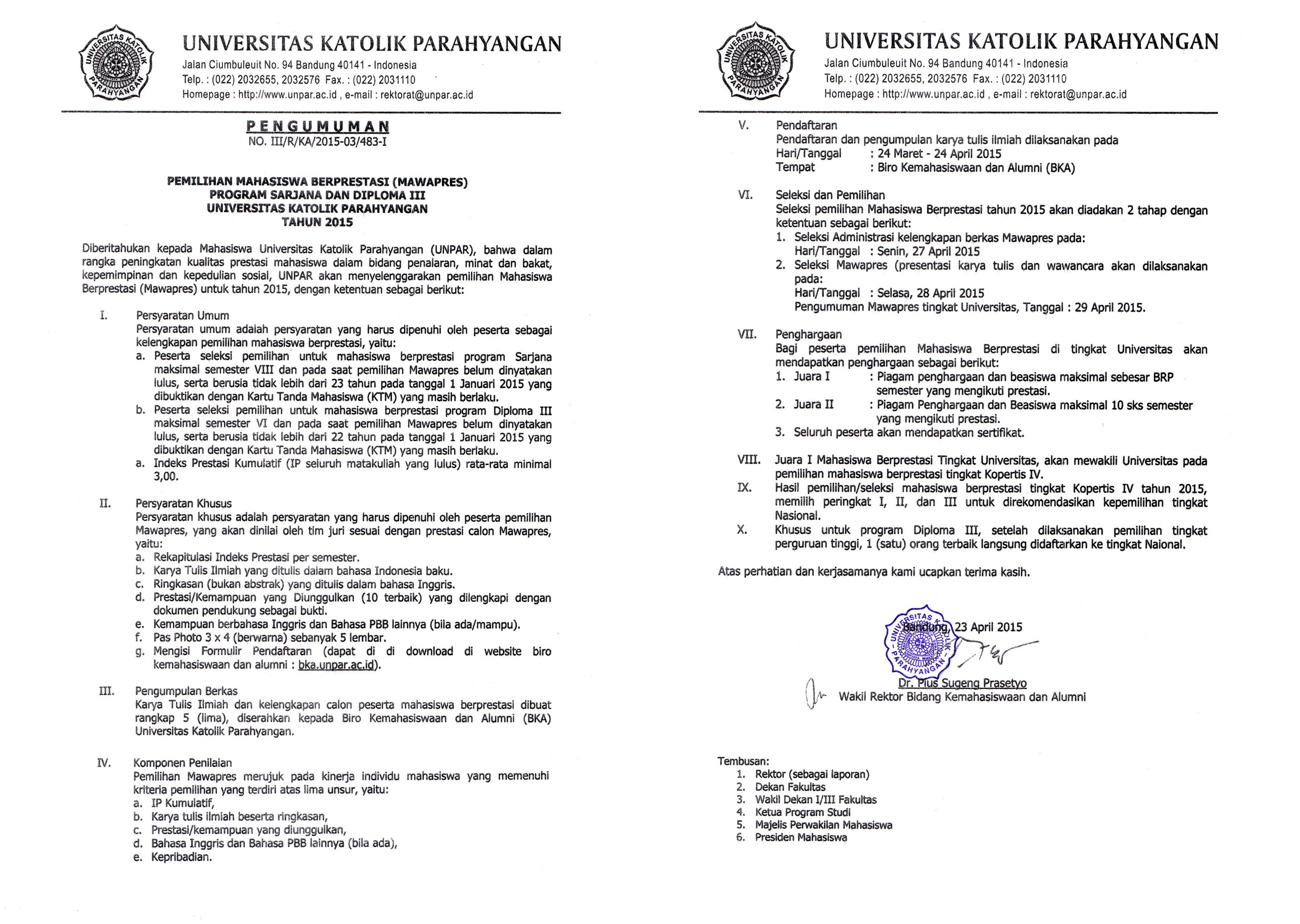Diberitahukan kepada Mahasiswa Universitas Katolik Parahyangan (UNPAR), bahwa dalam rangka peningkatan kualitas prestasi mahasiswa dalam bidang penalaran, minat dan bakat, kepemimpinan dan kepedulian sosial, UNPAR akan menyelenggarakan pemilihan Mahasiswa Berprestasi (Mawapres) untuk tahun 2015, dengan ketentuan seperti pada gambar berikut: